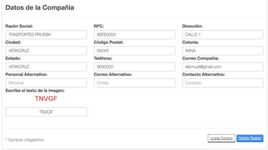Los campos que tienen un * son obligatorios, el ultimo campo en el apartado de Datos de la Compañía es un CAPTCHA, el cual debe ser ingresado de la imagen que se encuentra arriba del campo para que el registro se pueda completar.